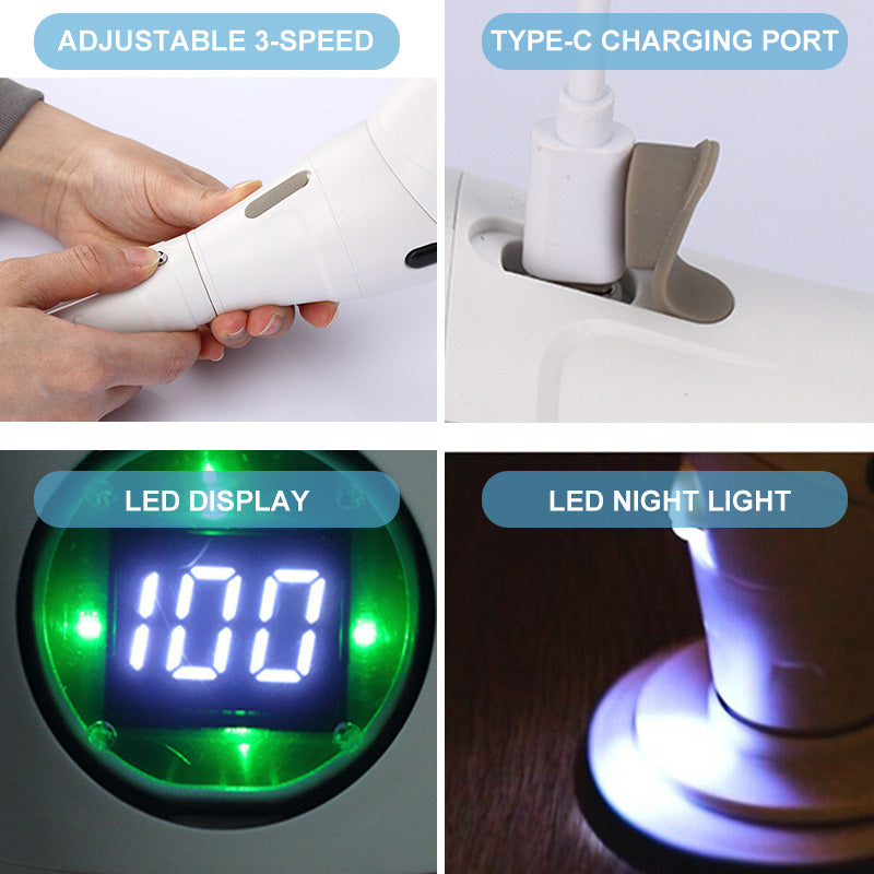 Det innebygde LED-displayet viser gjeldende hastighet og batteristatus, noe som gjør det enkelt å overvåke rengjøringsprosessen. I tillegg lyser LED-nattlyset opp mørke hjørner og hjelper deg med å oppdage skitt og smuss i områder med lite lys.