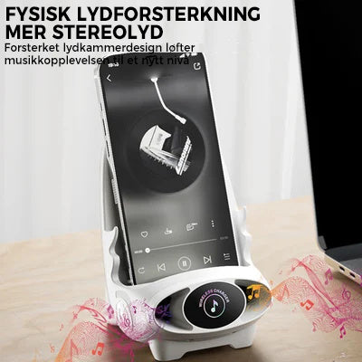Den trÄdlÞse lade-/mobiltelefonholderen er unik og nyskapende, og kan plasseres horisontalt eller vertikalt, og det er et lydhull nederst for Ä gjÞre lyden mer tredimensjonal nÄr telefonen spiller av.