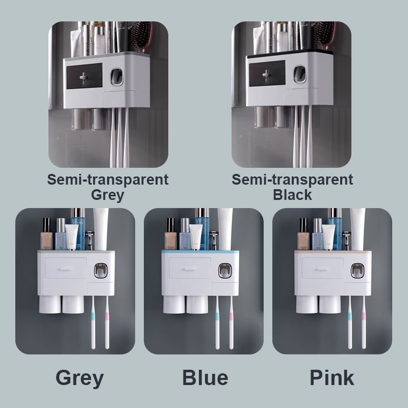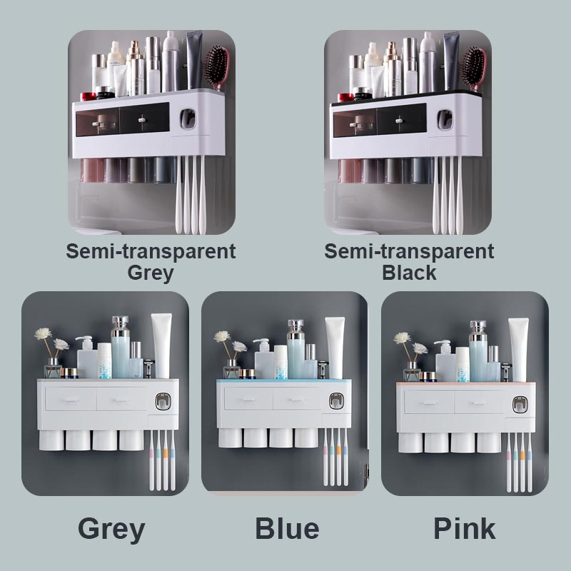 Denne multifunksjonelle tannbørsteholderen er utstyrt med en automatisk tannkremdispenser, som enkelt kan klemme tannkrem uten avfall. Den 2/3/4 magnetiske munnvannskoppen har en omvendt dreneringsdesign, som er støvtett og vanntett. Kan henge 6 tannbørster samtidig, passer for hele familien.